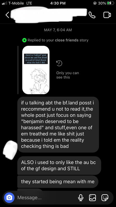 Reality Checking/Ableism Part 2April 4th, 2022In April, they came under the comments on one of my drawings, claiming that I’m “fake”. For someone who is NOT an irl and in fact, on record, a KINNIE, bf.land shouldn’t have anywhere to talk.I made a story post saying to not be like them and go out of your way to harass people who are doing nothing to you; and for the record, I didn’t even actually know it was bf.land, I thought they were one of those IRLs that were dicks and reality checked other people to make themselves feel more valid.They go on to say that my mention of my panic attack is “throwing a tantrum” over “other kinnies” (again) and twisting my words to a non-direct quote “stop reality checking other kinnies” when I had stated to not reality check doubles and it’s perfectly normal to believe they don’t exist as an irl but just don’t be a dick if you meet one. They say that I am not like Benjamin and never will be, but they are not either. I wouldn’t go out of my way to harass someone over quite a period of time over something like not being your friends friend. Not everyone will like me, I know that, but you have no place to talk when you believe that you somehow know how I would act when you’re NOT ME. It’s clear they are aware that I had a panic attack because of their reality checking because I had mentioned it in the same story post.I experience low empathy and compassion for others, I literally have BPD, but god, you are a dick as a neurotypical little ass kid, who is confirmed to be 12, to just be like this all because I wouldn’t be kaede’s bestie. And I don’t care that they’re “only 12”, they’re still a horrible fucking person for this. Age is not an excuse, especially since they seem to want to act mature all of the time.They go on to assume that I believe “Benjamin belongs to you[me]”, which I don’t. I understand that people think that I’m just a fictional character and I am aware I am from a piece of media but I’m still real.“get a life” i’m not the one actively going to my alts to harass someone else.And you know that they’re just calling me a kinnie on purpose at this point, because they put it in quotes. Mocking being an irl? How much more of an ableist dick can you be? I. I don’t really understand what they meant by gatekeeper. That I believe I’m Benjamin and no one else? I still subconsciously believe and know doubles exist, it’s a coping belief and it doesn’t hurt anyone as long as you’re not actively going to other doubles and reality checking them as I’ve said before.