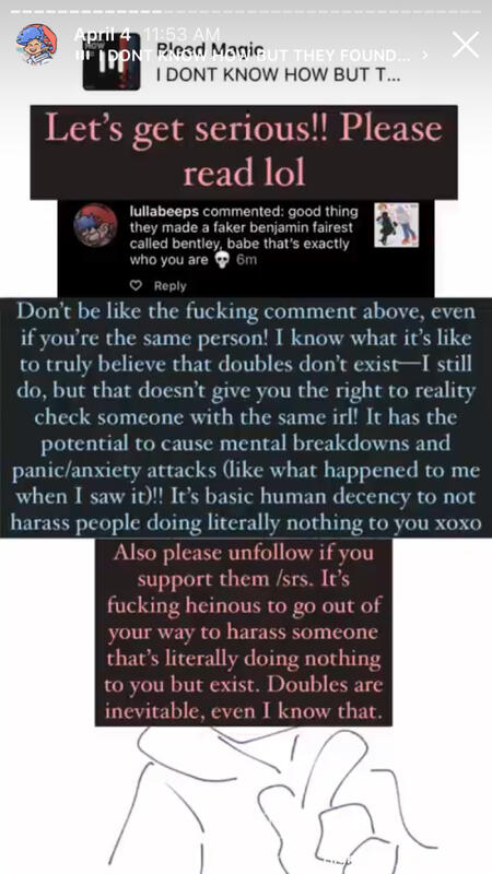 Reality Checking/Ableism Part 2April 4th, 2022In April, they came under the comments on one of my drawings, claiming that I’m “fake”. For someone who is NOT an irl and in fact, on record, a KINNIE, bf.land shouldn’t have anywhere to talk.I made a story post saying to not be like them and go out of your way to harass people who are doing nothing to you; and for the record, I didn’t even actually know it was bf.land, I thought they were one of those IRLs that were dicks and reality checked other people to make themselves feel more valid.They go on to say that my mention of my panic attack is “throwing a tantrum” over “other kinnies” (again) and twisting my words to a non-direct quote “stop reality checking other kinnies” when I had stated to not reality check doubles and it’s perfectly normal to believe they don’t exist as an irl but just don’t be a dick if you meet one. They say that I am not like Benjamin and never will be, but they are not either. I wouldn’t go out of my way to harass someone over quite a period of time over something like not being your friends friend. Not everyone will like me, I know that, but you have no place to talk when you believe that you somehow know how I would act when you’re NOT ME. It’s clear they are aware that I had a panic attack because of their reality checking because I had mentioned it in the same story post.I experience low empathy and compassion for others, I literally have BPD, but god, you are a dick as a neurotypical little ass kid, who is confirmed to be 12, to just be like this all because I wouldn’t be kaede’s bestie. And I don’t care that they’re “only 12”, they’re still a horrible fucking person for this. Age is not an excuse, especially since they seem to want to act mature all of the time.They go on to assume that I believe “Benjamin belongs to you[me]”, which I don’t. I understand that people think that I’m just a fictional character and I am aware I am from a piece of media but I’m still real.“get a life” i’m not the one actively going to my alts to harass someone else.And you know that they’re just calling me a kinnie on purpose at this point, because they put it in quotes. Mocking being an irl? How much more of an ableist dick can you be? I. I don’t really understand what they meant by gatekeeper. That I believe I’m Benjamin and no one else? I still subconsciously believe and know doubles exist, it’s a coping belief and it doesn’t hurt anyone as long as you’re not actively going to other doubles and reality checking them as I’ve said before.